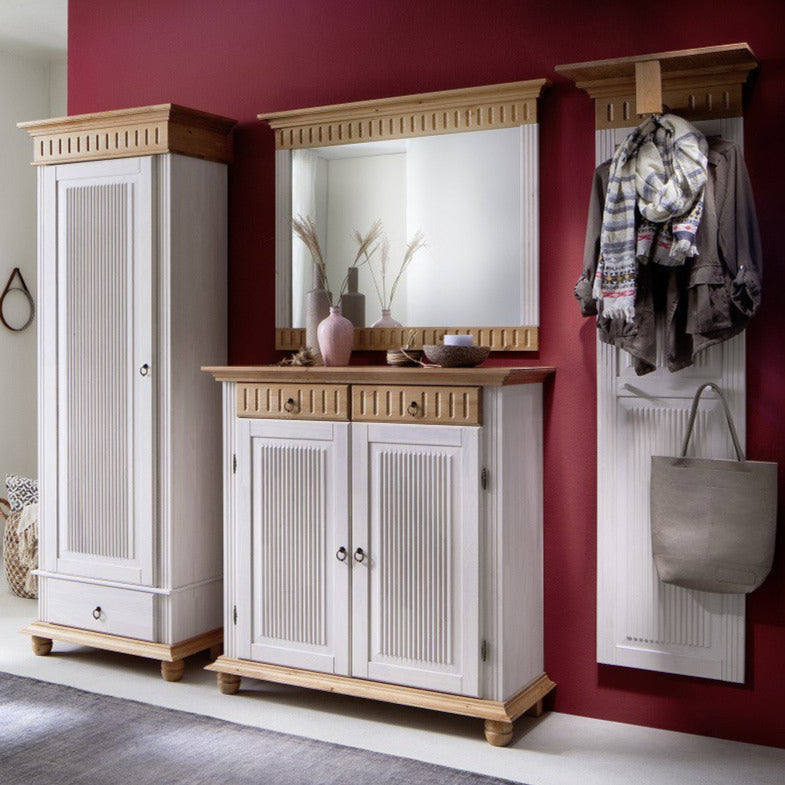 besticht durch seine helle und freundliche Ausstrahlung. Massives Kiefernholz weiß lasiert und verschiedenfarbig abgesetzt lebt den modernen Landhausstil. Die Riffelungen im Paneel unterstreichen den ländlichen Ausdruck und setzen verspielte Akzente. Eine Kleiderstange im oberen Bereich und 2 Aufhänger in der Mitte des Paneels geben Jacken und Mäntel schnell einen Platz zum Aufhängen. Speziell für kleinere Flure oder auch in kleineren Ecken findet dieses Garderobenpaneel als Solitär-Möbel seinen Platz. Für großzügige Eingangsbereiche bietet sich dieses Paneel in Kombination mit anderen Garderobenschränken aus der Serie HELSINKI an. Als Komplett-Garderobe immer ein Hingucker, der sofort alle Blicke auf sich zieht.