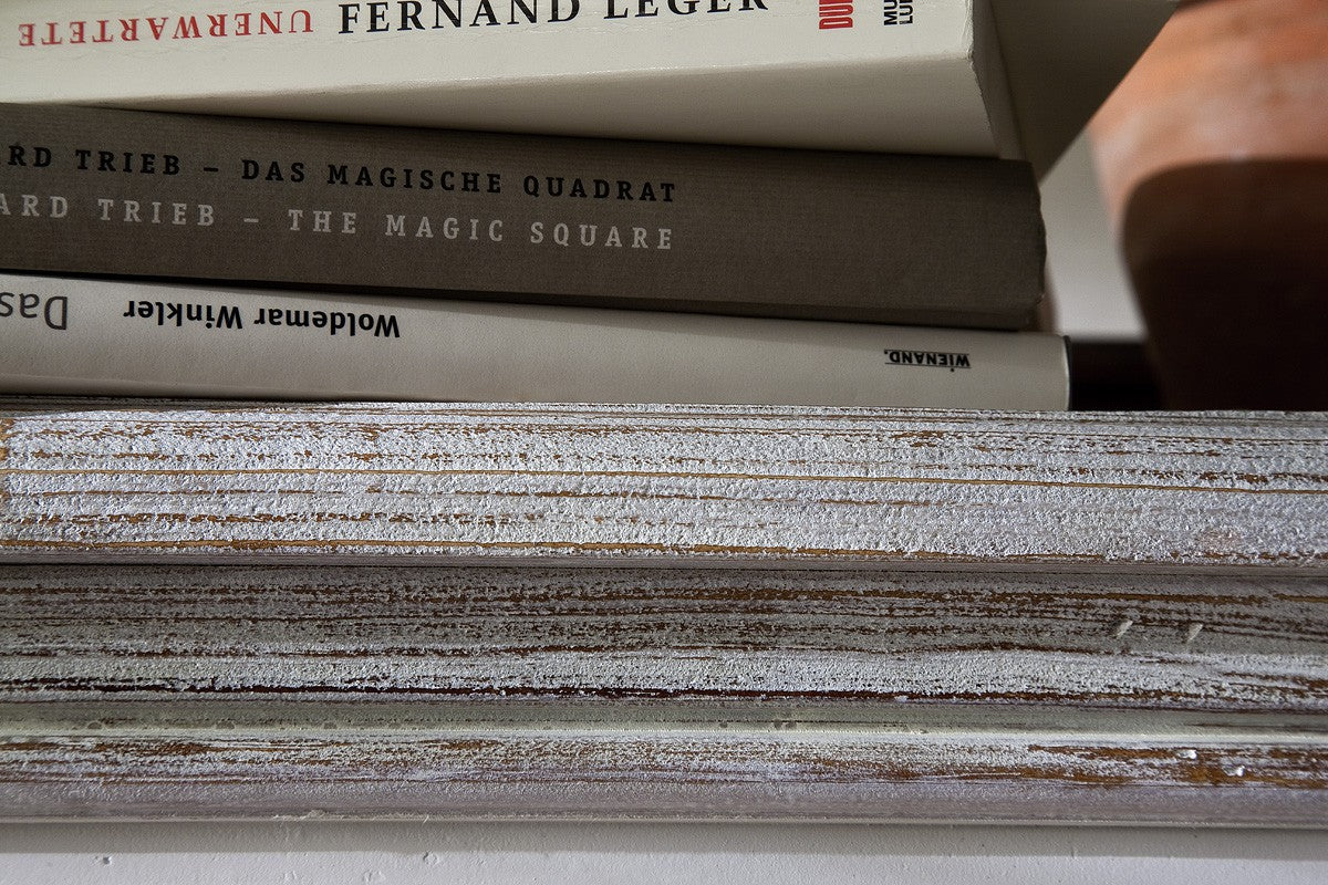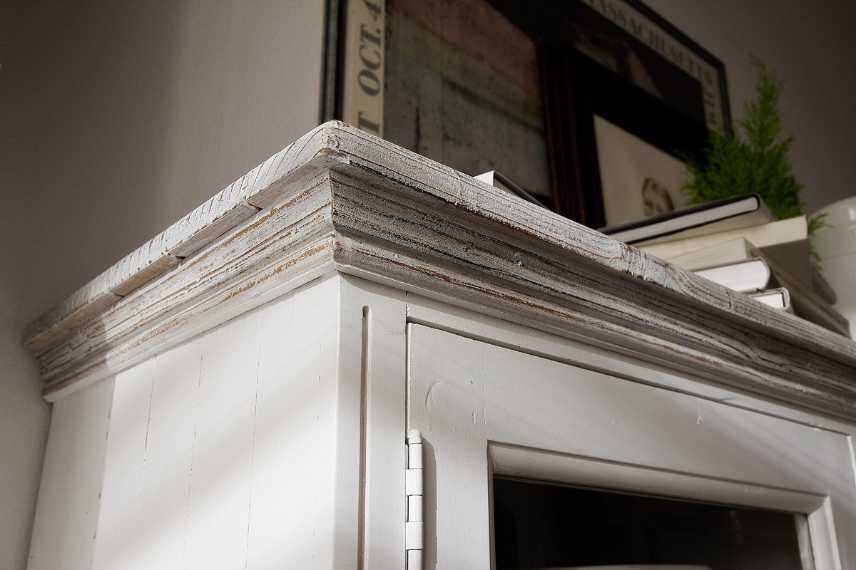 Der aus massivem Kiefer-Recycleholz bestehende Korpus der Möbelstücke wurde in der Farbe Altweiß mit Gebrauchsspuren und sichtbaren Holzmaserungen lackiert, die Kranz Absetzungen sind white sanded Kiefer gesandstrahlt.