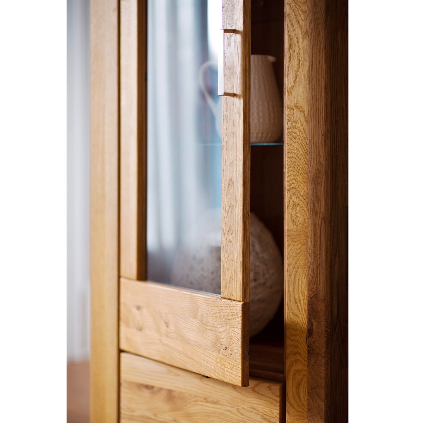 vereint handwerkliche Verarbeitung und klassisches Design. Das massive Wildeichenholz sorgt für ein natürliches Wohnambiente und setzt Akzente. Zeitlos schön und immer im Trend sorgt Nevada für die Extraportion Wohnlichkeit. Die geölte Oberfläche unterstreicht die wunderschöne Maserung und hebt diese zusätzlich hervor. 4 Füße sorgen für einen sicheren Stand und wertige Metallgriffe im Farbton Silber runden das Gesamtbild perfekt ab. Das Highboard ist optisch ein Highlight und steht im Mittelpunkt Ihres Wohn- oder Esszimmers. Neben der äußerst gelungen Optik beeindruckt dieses Möbelstück zusätzlich mit viel Stauraum. Hinter zwei Holztüren und in 2 Schubkästen finden viele Alltagsgegenstände einen Aufbewahrungsplatz. Hinter einer Glastür mit einem Glaseinlegeboden setzen Sie schöne Accessoires perfekt in Szene.