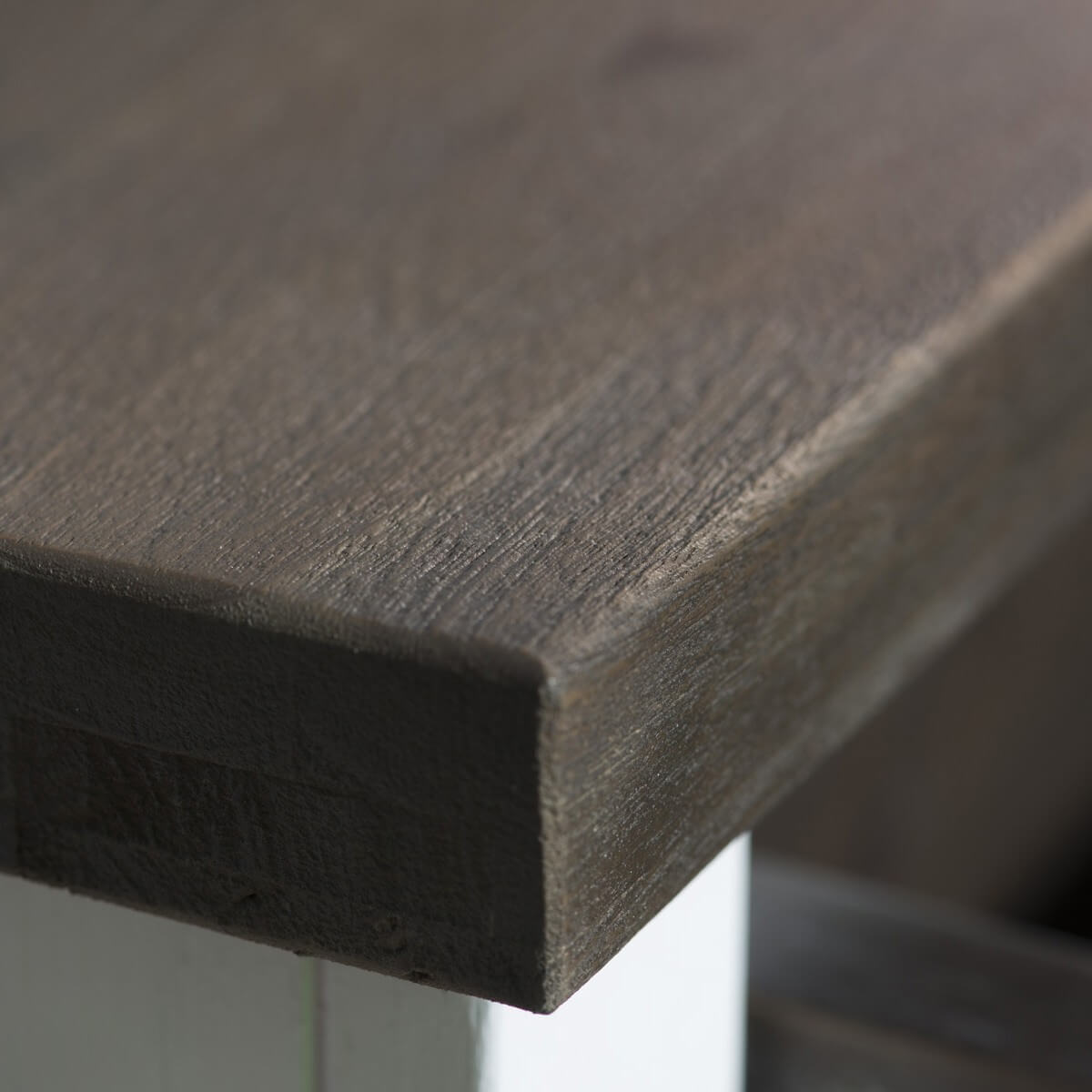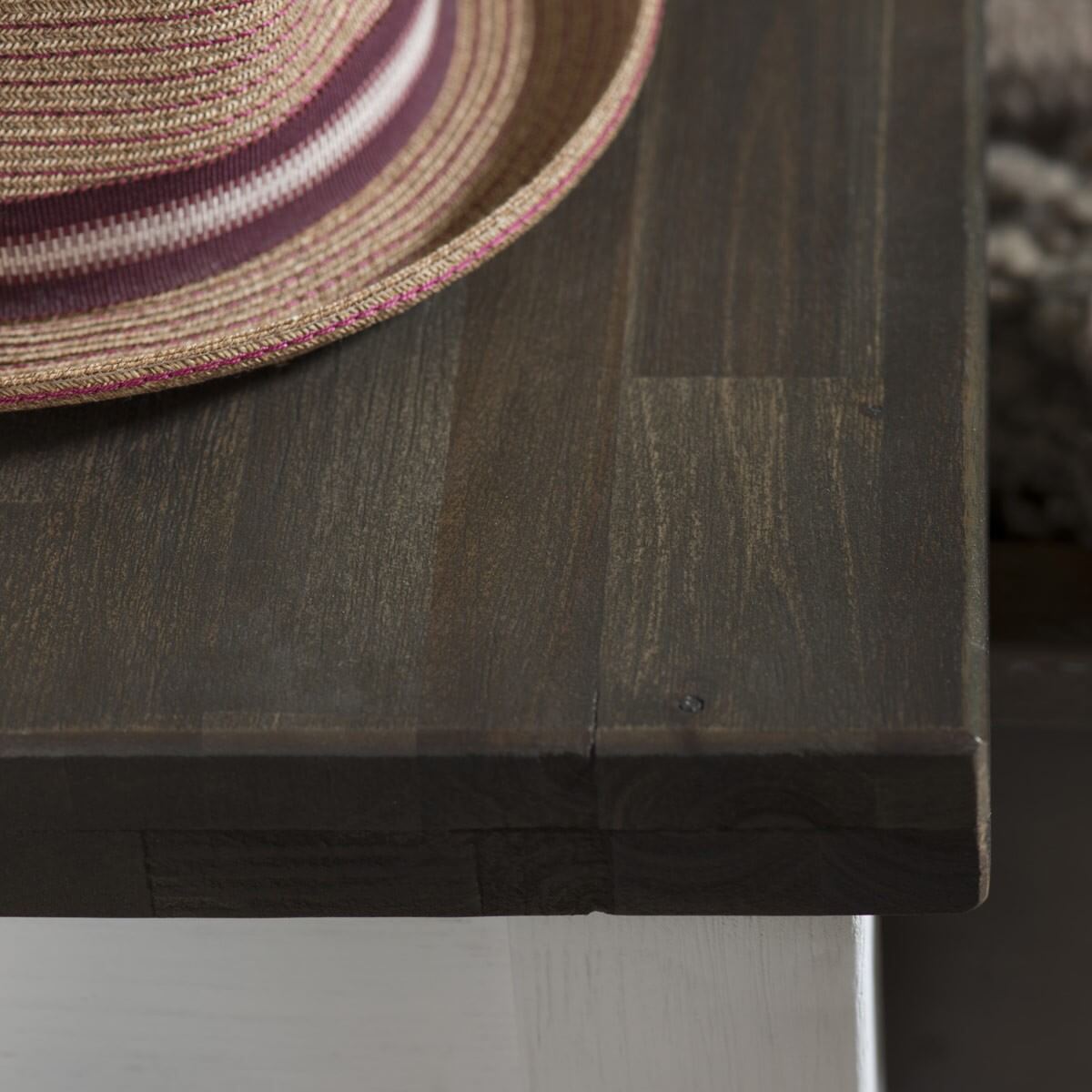Die Oberfläche des Holzes wurde sehr rustikal gearbeitet, wodurch diese Möbelserie seinen ganz eigenen Charakter erhält. Stilvoll in weiß, mit dunkelbraunen Absetzungen, erhalten Sie ein außergewöhnliches Wohlfühl-Ambiente.