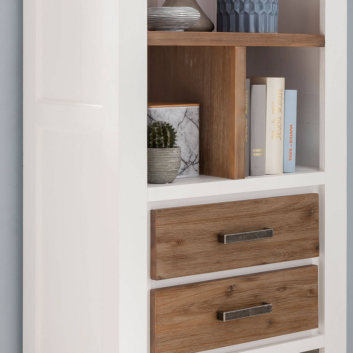 Für den Bau der Lalé Möbel wird massives Akazienholz verwendet. Dieses gehört zu den sogenannten Harthölzern und ist extrem belastbar. Die Oberflächen werden von Hand gebürstet, wodurch Weichholzanteile entfernt werden. Außerdem erhält die Oberfläche so eine wunderschöne Optik. Der Korpus des Regals erhält nur eine leichte Bürstung und erstrahlt in einem freundlichen Weiß. Die Einlegeböden und die Schubkästen werden robust gebürstet und kommen in einem warmen Cappuccino-Ton daher. Natürlich dürfen Soft-Close-Funktionen, sowie wertige Metallgriffe bei den Schubkästen nicht fehlen.