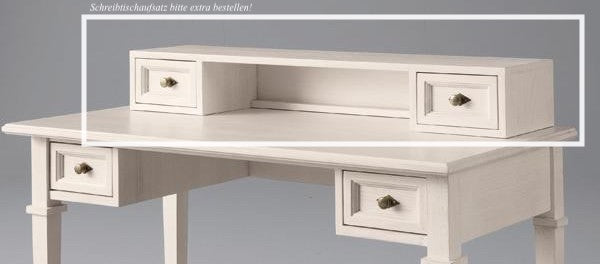 Dieser Schreibtisch bietet Ihnen eine Arbeitsfläche von ca. 120 x 60 cm. Rechts und links unterhalb der Tischplatte befindet sich jeweils eine Schublade. Auch bietet Ihnen der Tisch viel Beinfreiheit, was bei Schreibtischen im Landhausstil keine Selbstverständlichkeit ist. Weiterhin kann hier auf Wunsch ein zusätzlicher Schreibtischaufsatz hinzu bestellt werden, welcher für eine erhöhte Ablage, sowie für zwei zusätzliche Schubladen sorgt.