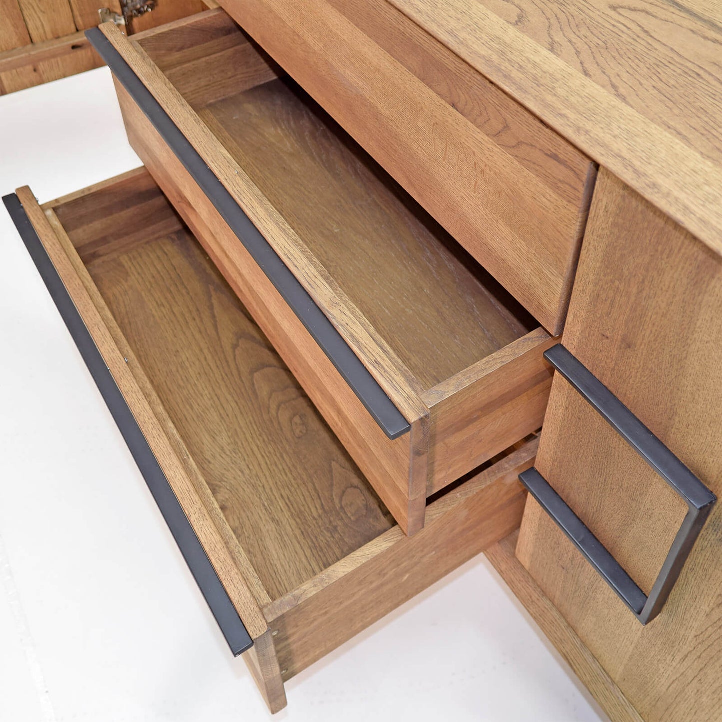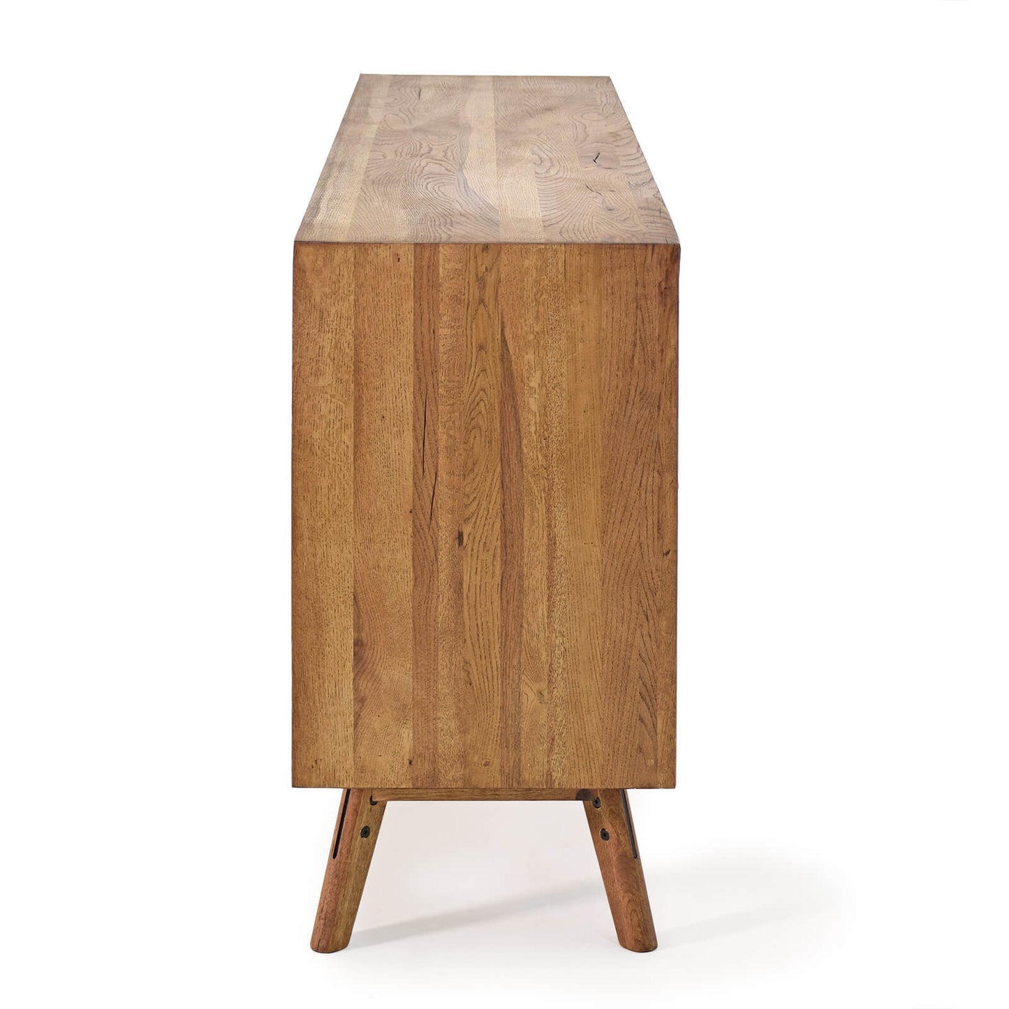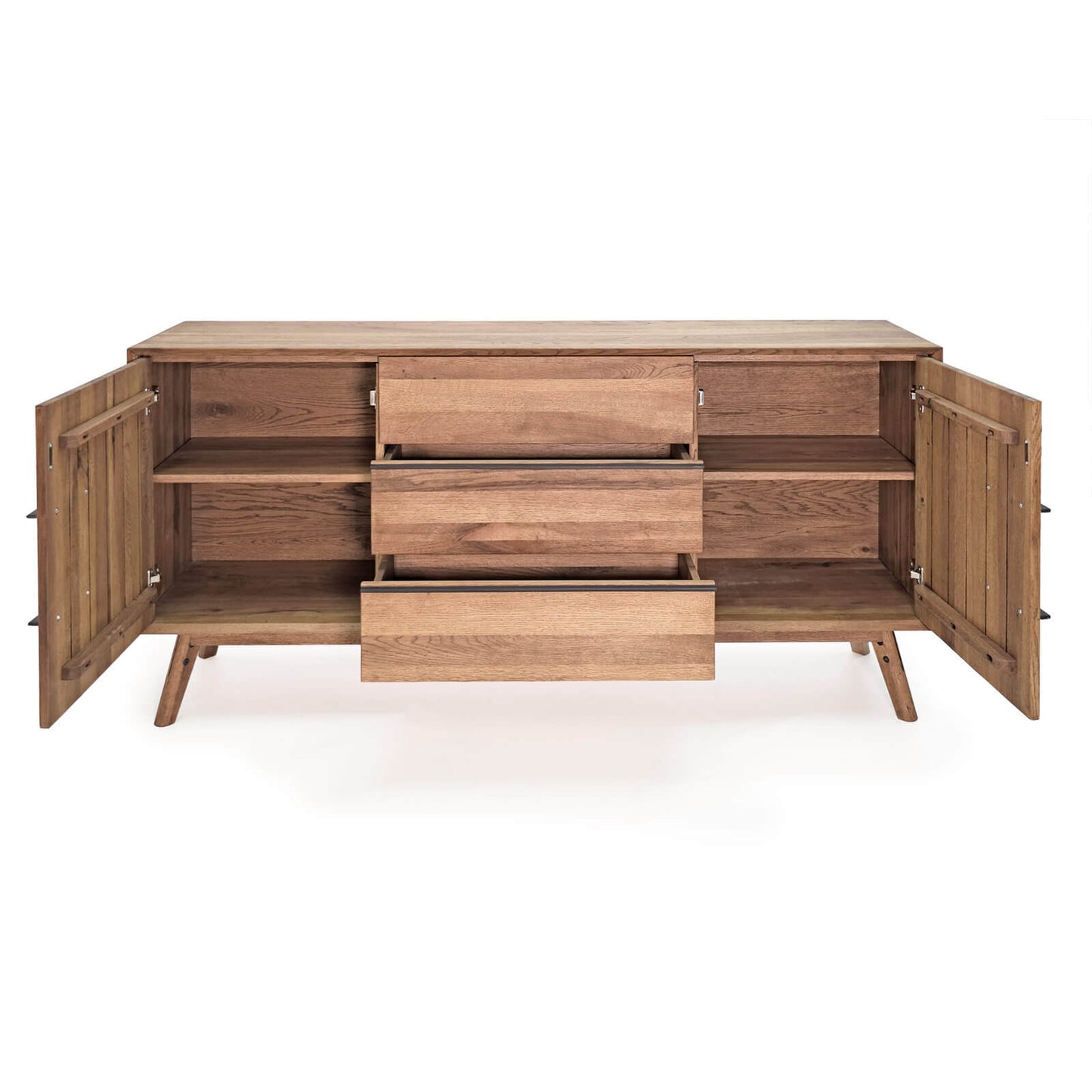 verleiht dem Sideboard seine Natürlichkeit. Die lebhafte Holzstruktur, die wunderschöne Farbgebung, sowie Unebenheiten und kleinere Risse zeichnen dieses Naturprodukt aus und verleihen ihm den Charme eines echten Unikates. Die liebevoll geölte Oberfläche schützt das Holz und ermöglicht zudem eine erfreuliche einfache Pflege. Wischen Sie das Sideboard einfach mit einem leicht angefeuchteten Lappen ab und fertig. Um die natürliche Schönheit des Holzes auch über Jahre zu gewährleisten, empfiehlt es sich den Tisch von Zeit zu Zeit nach zu ölen und oder wachsen.
