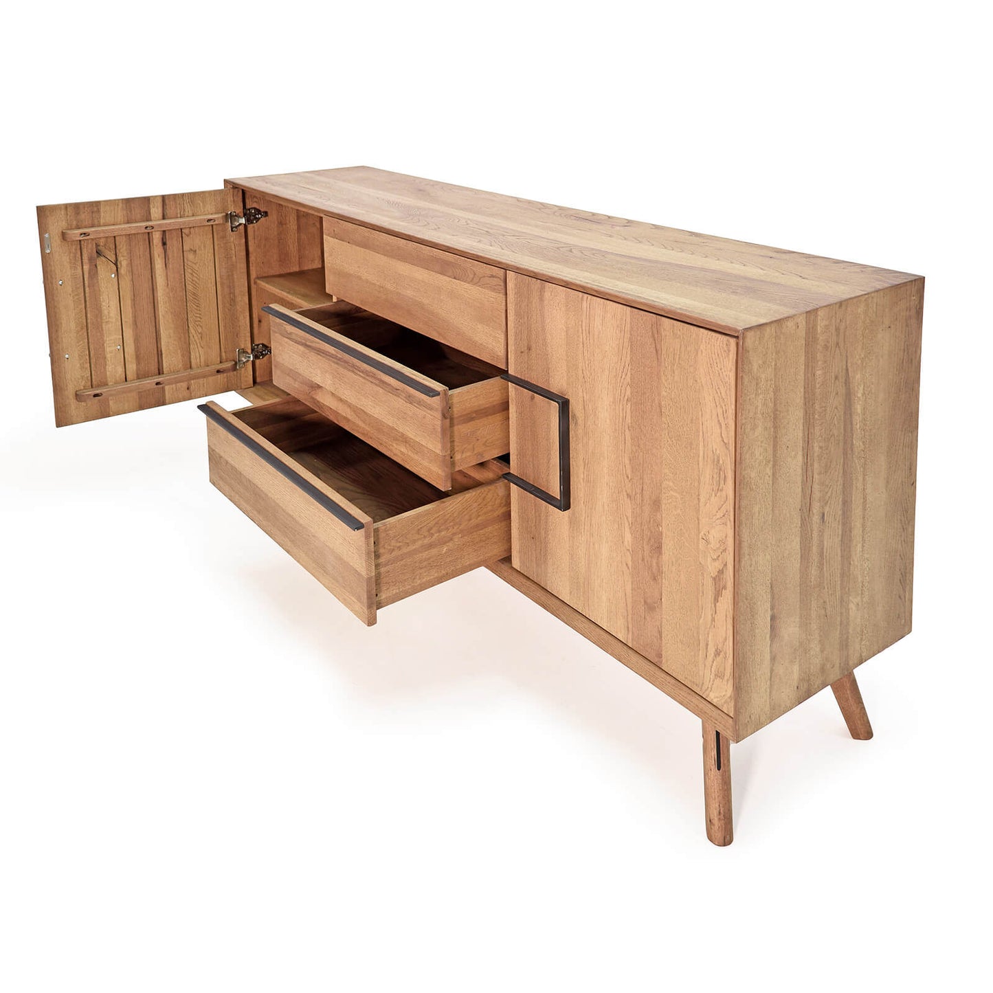 ist ein zeitlos, schönes Möbelstück, welches durch seine schlichte Eleganz sofort ins Auge sticht. Die filigranen, leicht abgeschrägten Füße verleihen dem Möbelstück eine Leichtigkeit, die nur im skandinavischen Stil zu finden ist. Die wertigen Metallgriffe runden das Gesamtbild perfekt ab und setzen Akzente. Neben der gelungenen Optik überzeugt dieses Möbelstück zudem mit viel Stauraum. Hinter 2 Holztüren und in 3 Schubkästen finden viele Alltagsgegenstände einen sichtgeschützten Aufbewahrungsplatz.