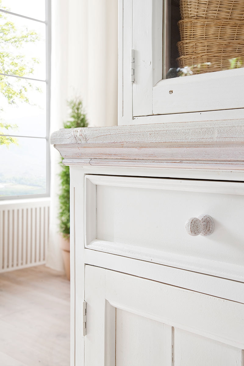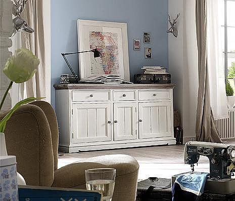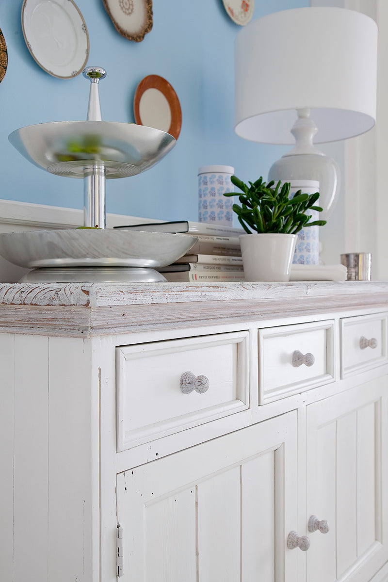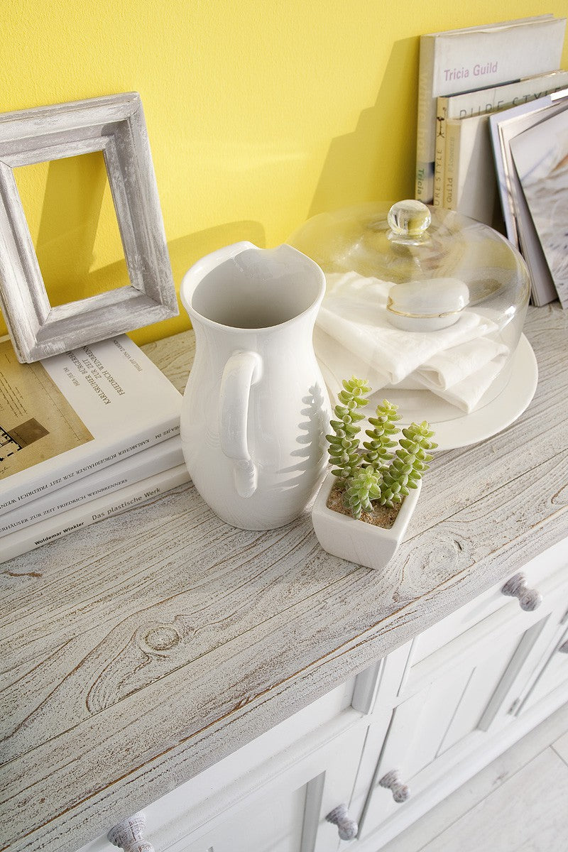 ist ein „Must-Have“ für alle, die den romantischen Landhausstil lieben. Die gelungene Farbgebung aus weißem Kiefernholz und die white sanded Absetzungen harmonieren perfekt und unterstreichen den natürlichen Charme dieses Möbelstückes. Kleine Spielerein wie, die Kassettenfüren, die markanten Holzknöpfe setzen das Sideboard in Szene und setzen zudem Akzente. Neben der äußerst gemütlichen Ausstrahlung bietet dieses Möbelstück aber auch viel Stauraum.