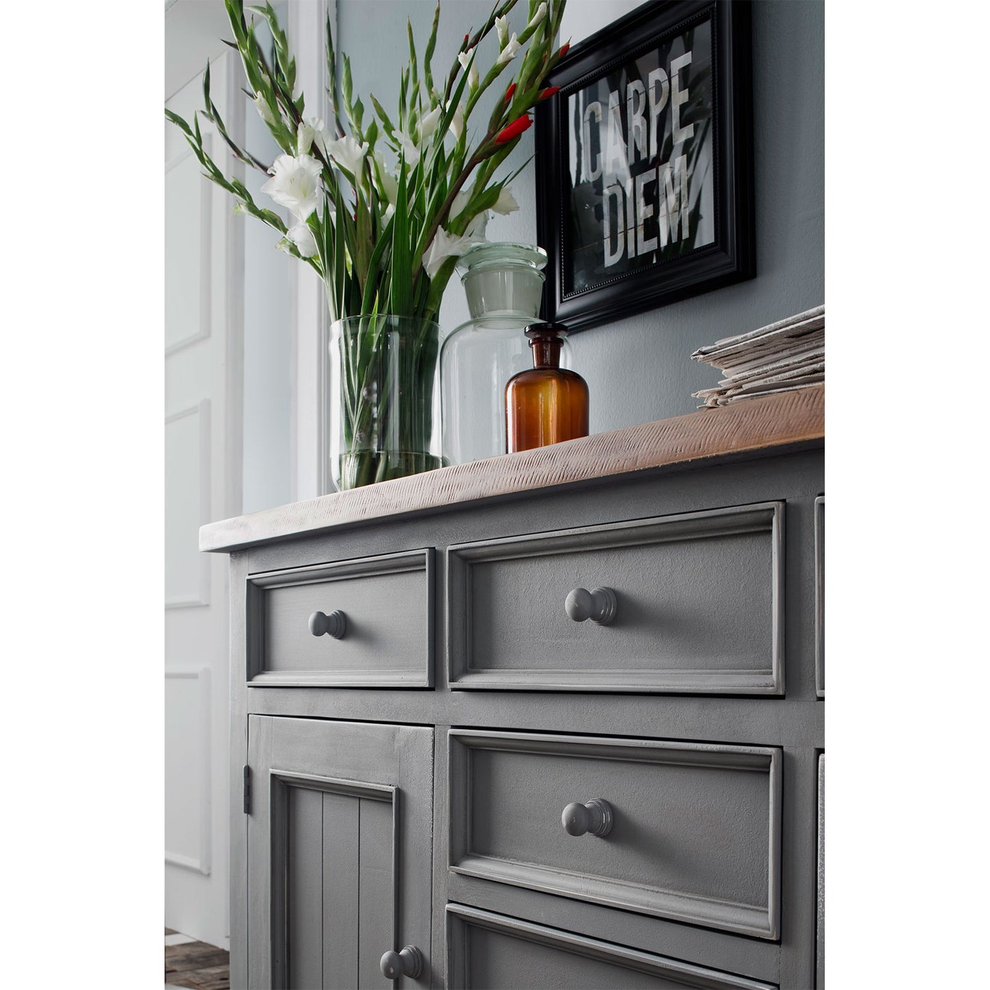 ist ein vielseitig kombinierbares Möbelstück, welches mit seinem ländlichen Charme ein ganz wohliges Ambiente zaubert. Der grau lackierte Korpus unterstreicht die einmalige Holzstruktur und hebt diese zusätzlich hervor. Die naturfarbige Absetzung mit seiner natürlichen Farbgebung fügt sich harmonisch ins Gesamtbild ein und verleiht dem Sideboard das gewisse Etwas. Verspielte Details, wie z.B. die knuffigen Holzgriffe oder die leicht abgeschrägten Füße fügen sich hervorragend ein und setzen Akzente. Hinter zwei Holztüren mit je einem Einlegeboden und in 6 Schubkästen verfügt das Möbelstück über viel Stauraum und Sie können alles gut sortiert aufbewahren. Die Serie Byron wird aus recyceltem Pinienholz und mit ganz viel Liebe zum Detail gefertigt. So werden alle Kanten in echter Handarbeit abgerundet und geschliffen. Jedes Möbelstück ist individuell und einzigartig und garantiert ein echtes Unikat. Ein Naturprodukt, das Ihren Wohnraum trotz seiner leicht rustikalen und robusten Optik mit einer aparten Leichtigkeit erfüllt und für ein gemütliches Wohnambiente sorgt.