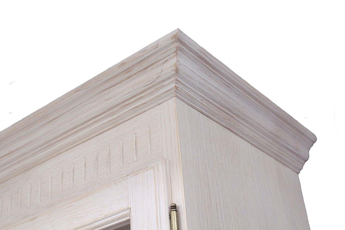 Der Landhausstil steht für Wärme, Gemütlichkeit und bringt etwas Rustikalität mit. In dem Fall der Malaga Möbel strahlt diese Stilrichtung einen einzigartigen Charme aus, denn bei diesem Anblick sieht man sofort, dass hier individuell von Hand gefertigte Möbel stehen. Die Kränze und Sockel, sowie die Schubkastenblenden haben aufwendige Verzierungen und lassen das Gesamtbild sehr fein wirken. Die Glasscheiben der Vitrinen sind mit Holzleisten verziert.