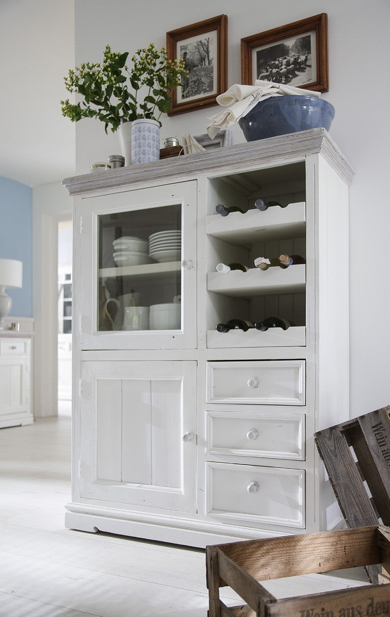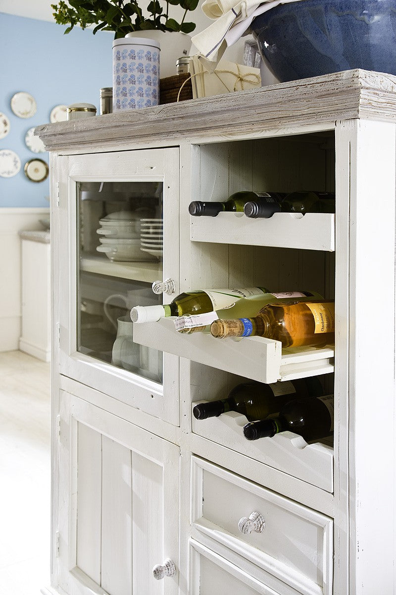 ist ein Schrank, eine Vitrine und ein Flaschenregal zu gleich. Mit dieser praktischen Kombination bereichert dieser Massivholzschrank jedes Esszimmer. Hinter der Glastür haben Sie zwei Fächer für edle Gläser oder Geschirr, während Sie hinter der Holztür zwei Stauraumfächer erhalten. Die drei Schubkästen sorgen für zusätzlichen Platz, welcher sich bestens für Besteck, Flaschenöffner und Ähnliches eignet. Das Regalfach ist durch drei Böden unterteilt, welche Ausfräsungen besitzen, sodass hier Weinflaschen liegend gelagert werden können. Besonders praktisch ist, dass sich die einzelnen Böden herausziehen lassen.
