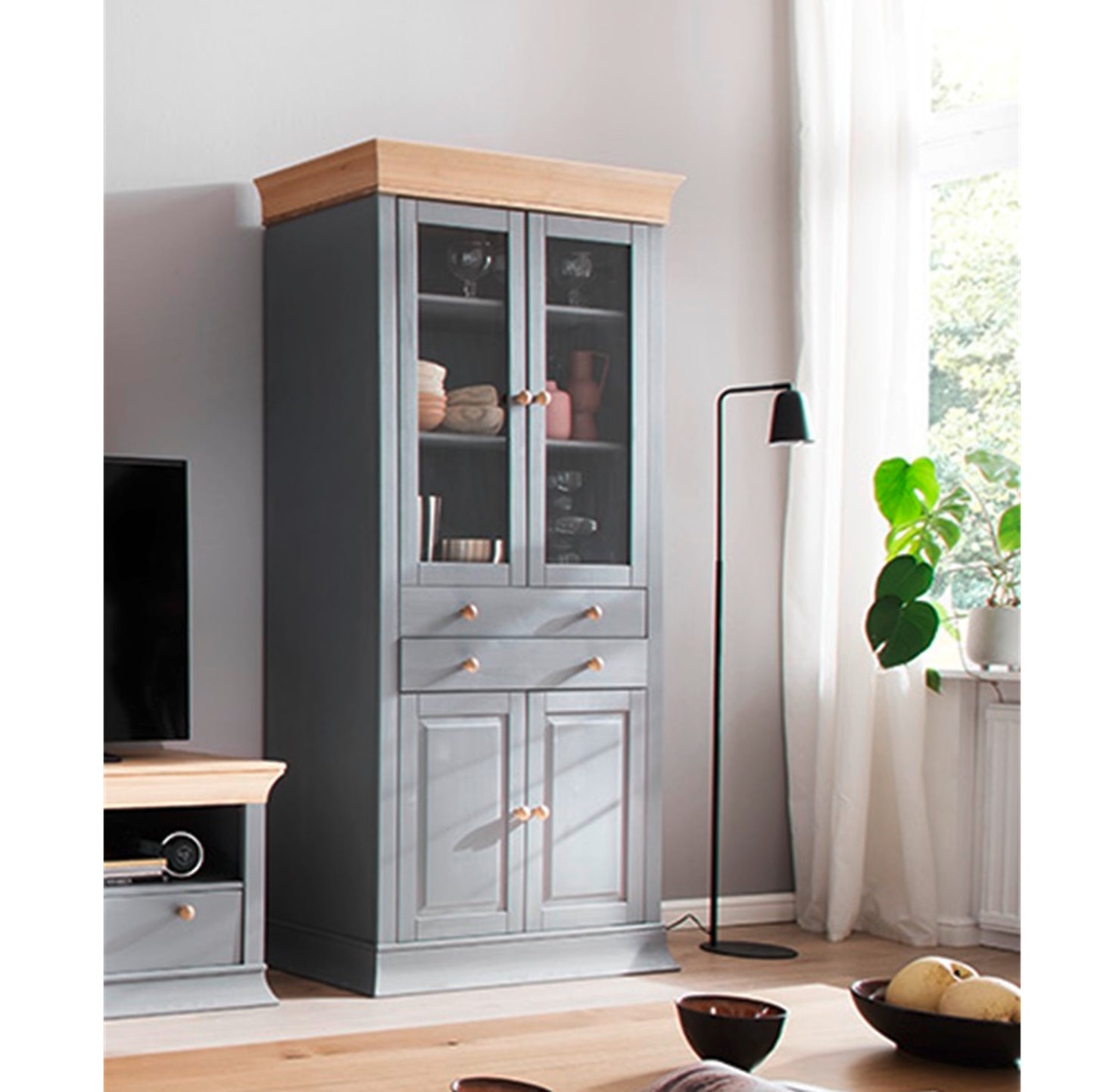 Die Vitrine besticht aber nicht nur durch eine gelungene Optik, sondern auch mit sehr viel Stauraum. Hinter zwei Glastüren befinden sich zwei Einlegeboden und geben hübschen Accessoires einen Aufbewahrungsplatz. Hinter zwei Holztüren und in zwei Schubästen finden viele Alltagsgegenstände einen sichtgeschützten Platz.