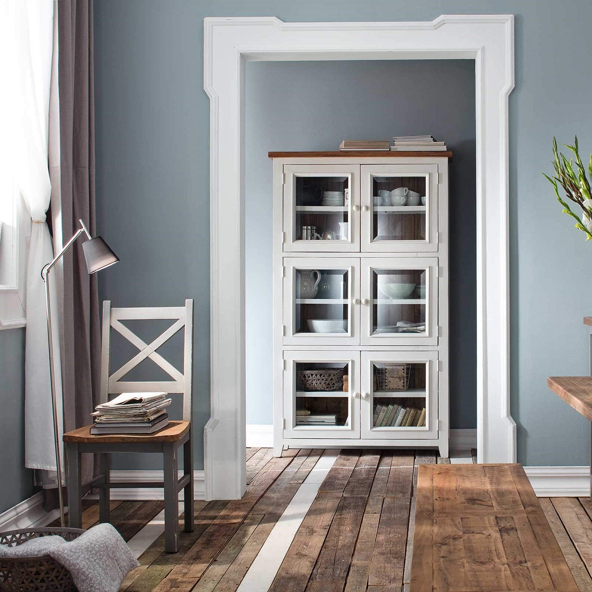 im verträumten Landhausstil verleiht jedem Raum eine helle und freundliche Atmosphäre. Eine Vitrine mit viel Stauraum und stilvollem Design. Der weiß lackierte Korpus harmoniert perfekt mit den naturfarbigen Absetzungen und kombiniert das aktuelle Landhausflair mit einem Hauch von Shabby Chic. Hinter 6 Glastüren mit edlem Facettenschliff können Sie schicke Accessoires staubgeschützt zur Schau stellen. Massives, recyceltes Pinienholz verleiht dem Möbelstück mit seiner einzigartigen Holzmaserung einen wohligen Charme gepaart mit natürlicher Leichtigkeit. Verspielte Details wie die knuffigen Holzgriffe heben den individuellen Look hervor und setzen Akzente. Jedes Möbelstück ist ein echtes Unikat und wurde mit viel Liebe zu Detail gefertigt. So wurden z.B. alle Kanten von Hand geschliffen und die Kanten abgerundet. Die lackierte Oberfläche schützt das Holz vor allen Anforderungen im Alltag, unterstützt die Langlebigkeit und sorgt für eine erfreulich einfache Pflege.
