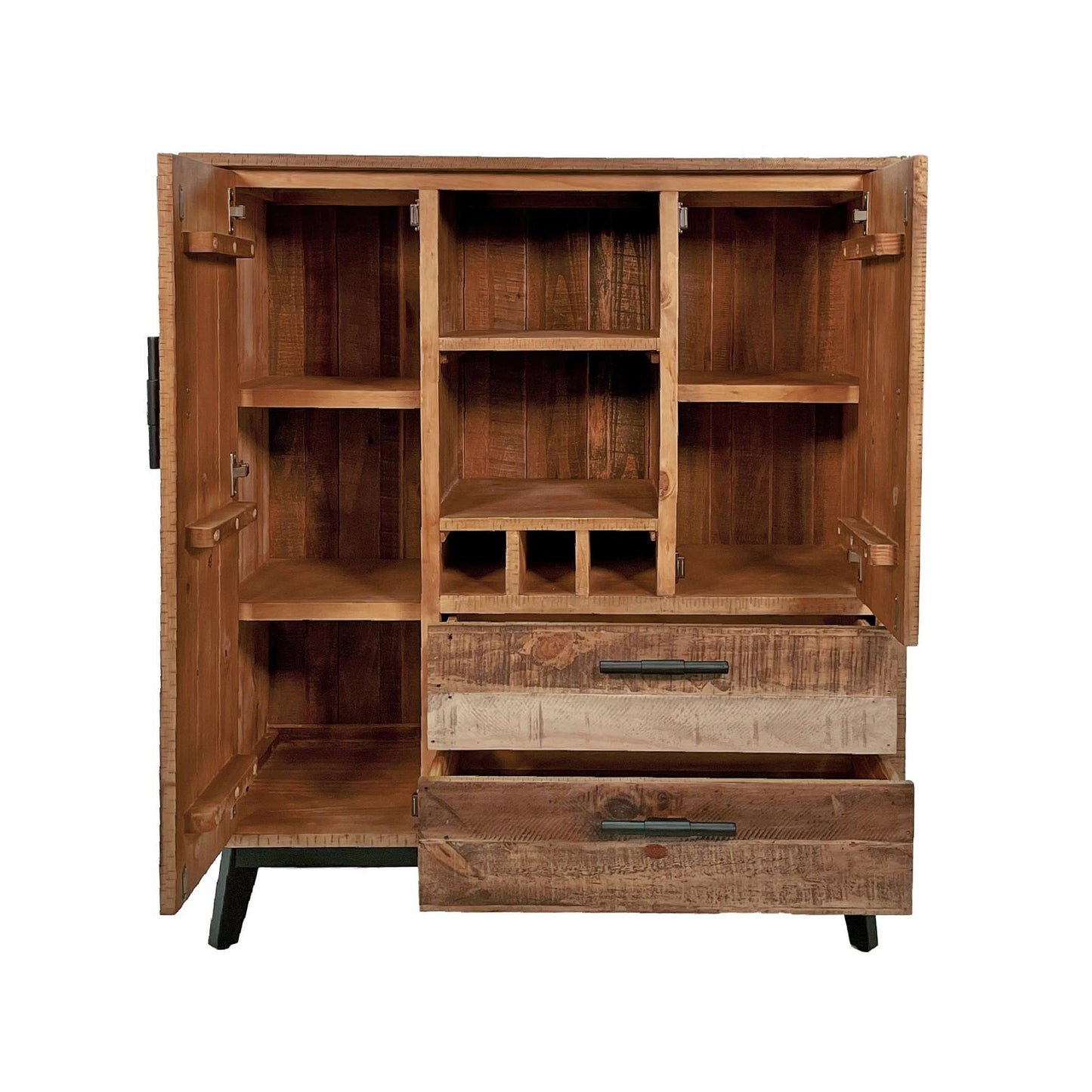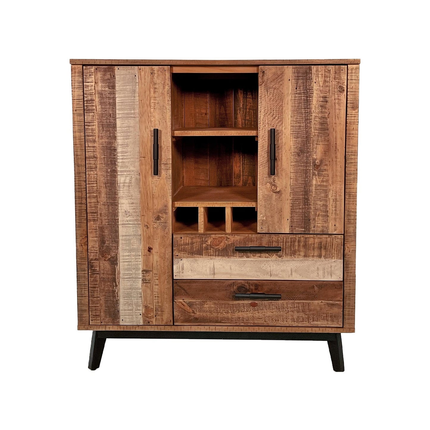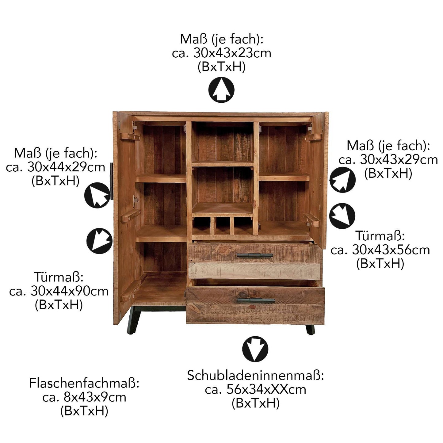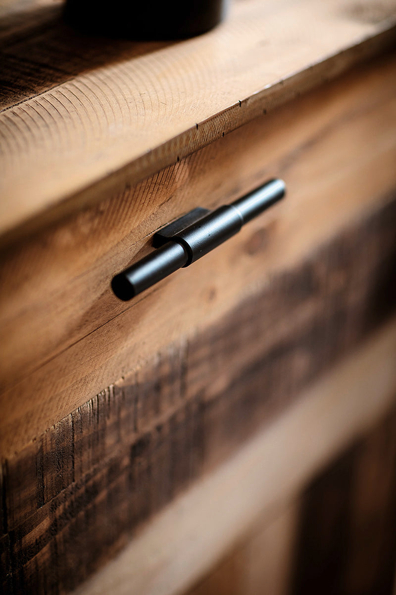 wurde in echter Handarbeit gefertigt und setzt ein Statement in Sachen Interiordesign. Urwüchsiges Pinienholz mit einer markanten Maserung und minimalistischen Retro Elementen begeistert auf ganzer Linie. Hier entstehen echte Unikate mit einem unverkennbaren Look. Unterschiedliche Holzelemente und das harmonisches Farbspiel wird mit zartem Altweiß durchzogen und sorgt für ein außergewöhnliches Wohnambiente. Liebevolle Details wie imitierte Nagellöcher unterstreichen das natürliche Design und stehen im Kontrast zu den schwarzen Metall-Akzenten.