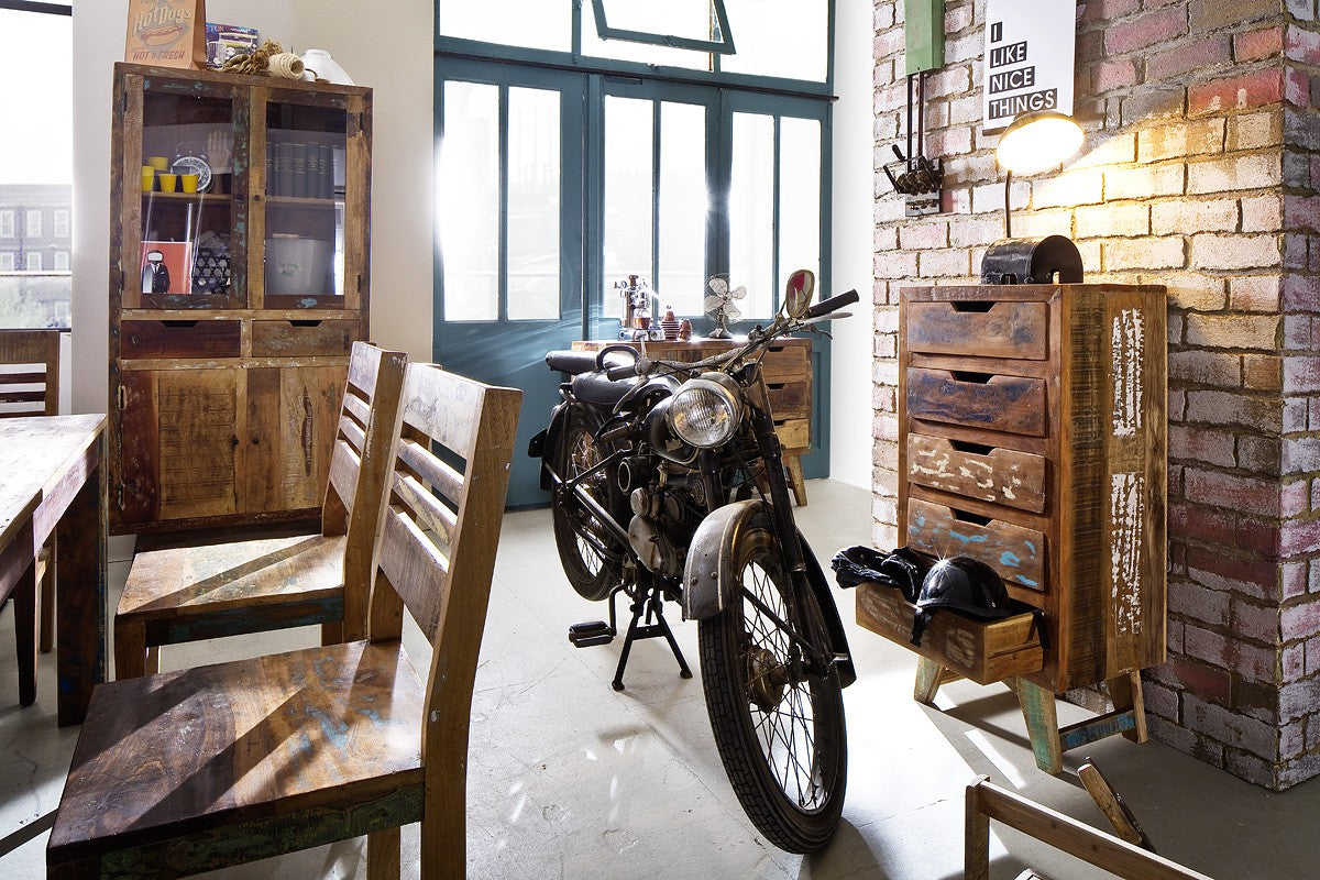 stammt aus unterschiedlichen Hölzern. Massivholz, welches auf eine lange Geschichte zurückblickt. Holz aus alten Häusern, aus alten Booten, von Treppen oder einfach auch nur Dachlatten. Massives Holz das mit neuem Leben versehen wird. Mit viel handwerklichem Geschick wird das Holz recycelt und zu äußerst trendigen Möbeln verarbeitet. Aufgrund der langen Vorgeschichte ist das Holz bereits sehr gut durchgetrocknet und die Möbel können sich nicht mehr verziehen. Die Oberfläche ist lackiert, die Poren sind versiegelt und die Pflege ist daher erfreulich einfach.