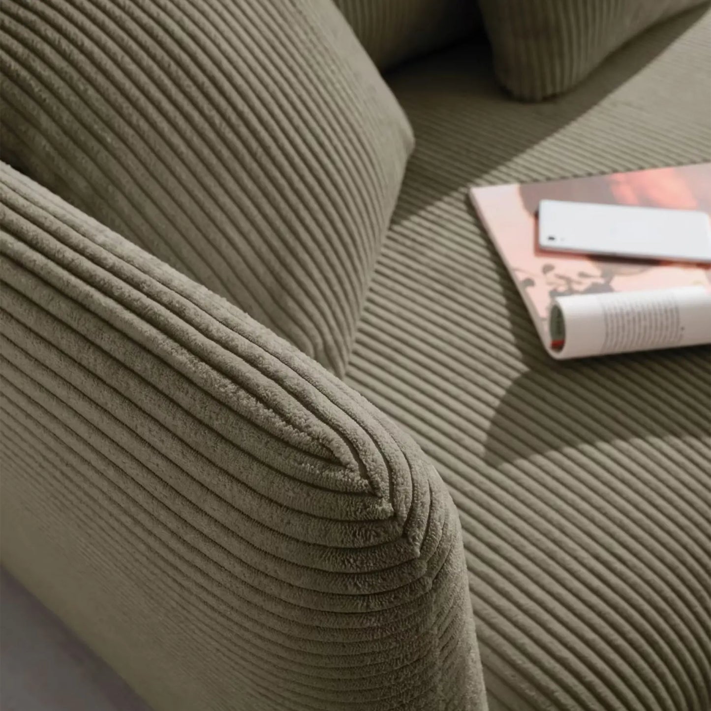 Der Cord-Bezug sorgt nicht nur für ein modernes, trendiges Erscheinungsbild, sondern ist auch robust und pflegeleicht. Das Grün bringt Lebendigkeit in den Raum und lässt sich hervorragend mit natürlichen Materialien oder hellen Farben kombinieren – ein echtes Highlight für moderne Wohnkonzepte. Merle ist die perfekte Wahl für alle, die Komfort, Funktionalität und Design in einem Möbelstück vereinen möchten.