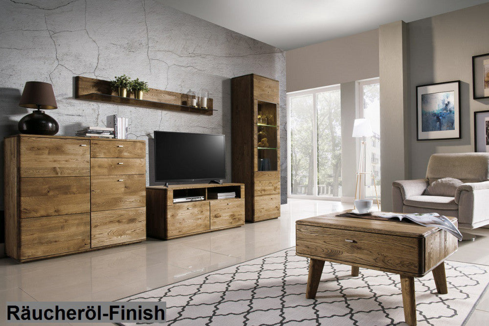 Die Vancouver Massivmöbel bieten eine große Auswahl an verschiedenen Komponenten. Zusätzlich können Sie selbst zwischen zwei Farbgebungen wählen. Bei der Farbgebung in natur behält das massive Eichenholz seine natürliche Farbgebung, während es bei dem Räucheröl-Finish dunkler wird. Beide Farben sorgen für eine natürliche und edle Ausstrahlung. Die geraden Linien mit den abgerundeten Kanten, in Verbindung mit dem dezenten Metallgriff schaffen neben der natürlichen Ausstrahlung einen Hauch Modernität.