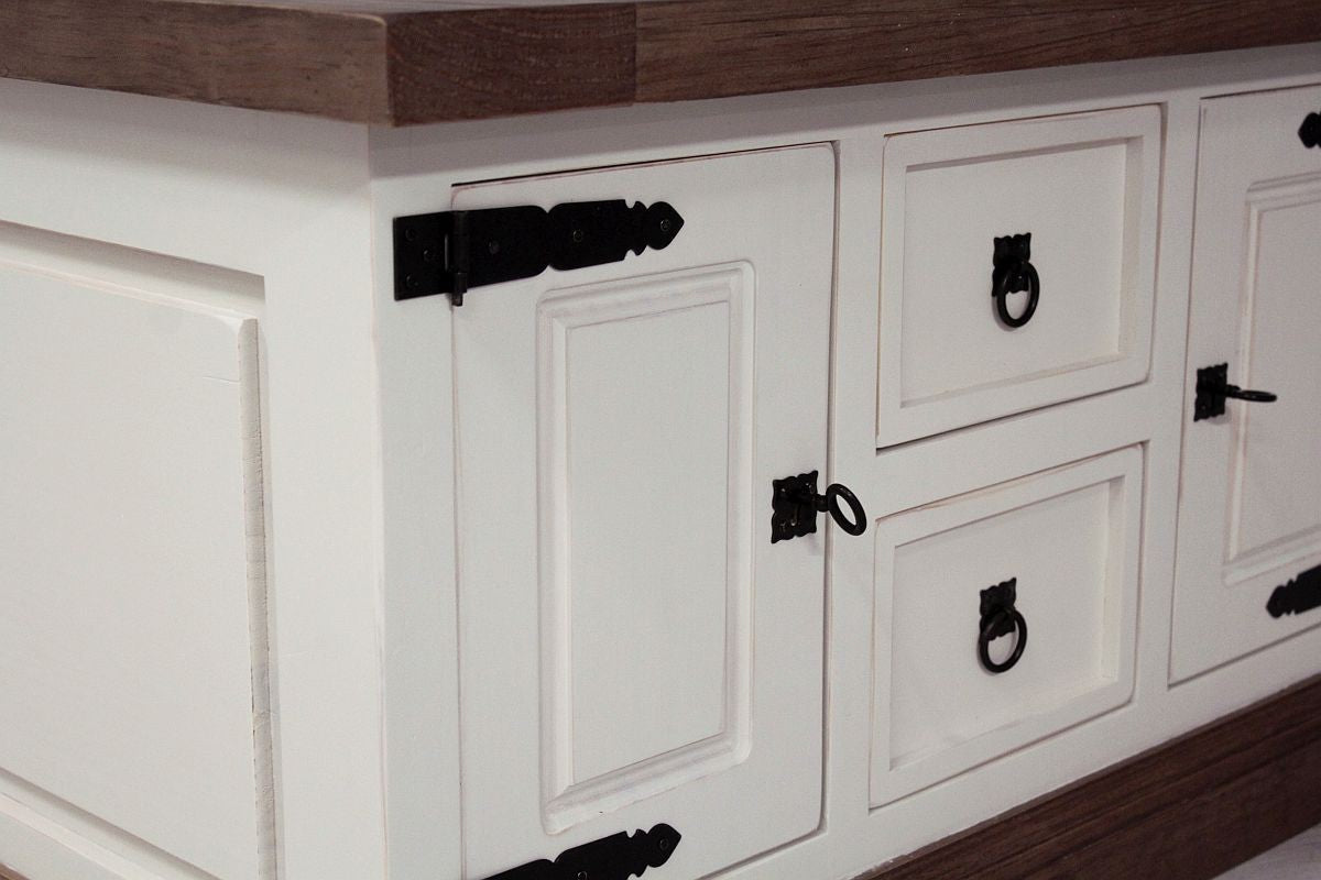 Hergestellt werden die Finca Möbel in einer kleinen spanischen Handmanufaktur. Dort laufen die Möbel nicht vom Fließband, sondern werden individuell gearbeitet. Sowohl die weiße Lackierung, als auch das Antikfinish geölt/gewachst werden von Hand aufgetragen. Anschließend werden, mit viel Liebe zum Detail kleine Gebrauchsspuren hinzugefügt. Diese Gebrauchsspuren machen jedes einzelne dieser Möbel zu einem echten Unikat. Die wertigen Metallbeschläge werden extra für diese Finca Massivholzmöbel geschmiedet und in einem Antik-Schwarz gefärbt. So bilden sie einen tollen Kontrast zu dem Korpus der Möbel.