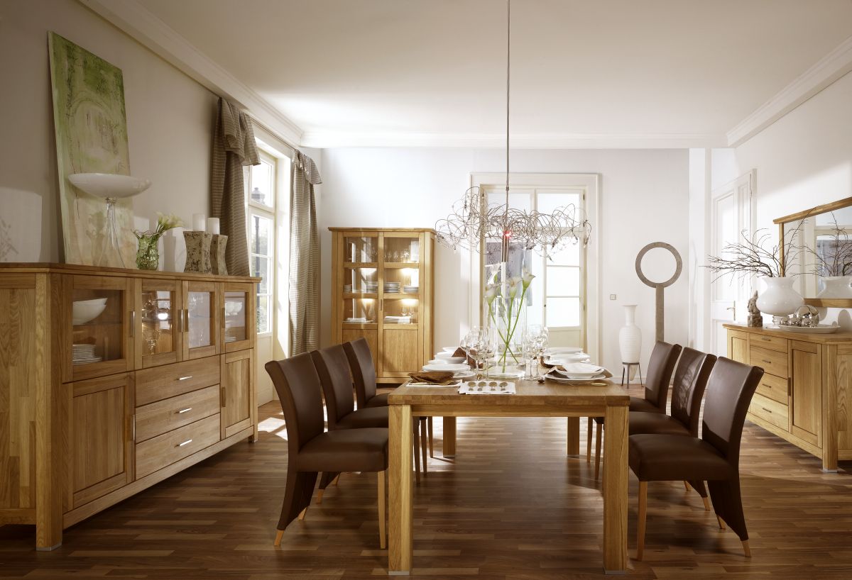 Der Esszimmertisch ist ein unverzichtbares Möbelstück. Hier trifft sich die ganze Familie, hier wird gesessen, geredet oder einfach nur mal mit Freunden ein Glas Wein getrunken. Dieser massive Tisch mit einer Breite von 210 cm bietet reichlich Platz für jeden. Er steht schlicht und dennoch imposant da. Kombinieren lässt sich dieser Tisch mit fast allen Stühlen. Egal ob der moderne Freischwinger oder der klassische Polsterstuhl, sogar Rattanstühle machen eine gute Figur. Die 9 x 9 cm starken Füße sind an den äußeren Ecken angebracht, sodass sie beim Sitzen niemanden stören. Sie sorgen für einen sicheren und stabilen Stand. Die Tischplatte ist aufgrund der geölten Oberfläche einfach zu reinigen. Hierzu nehmen Sie ein feuchtes, weiches Tuch und wischen den Tisch mühelos ab. Mit diesem Esstisch holen Sie sich die Natur ins Haus. Das massive Eichenholz mit seiner einzigartigen Struktur wird Sie garantiert begeistern!