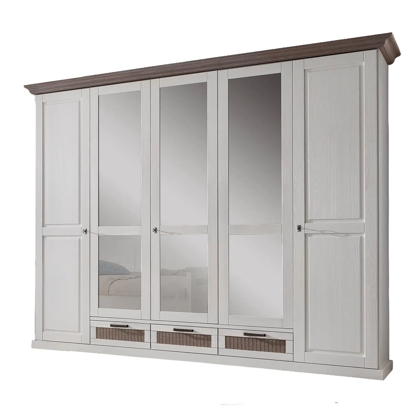 5-türiger Kleiderschrank in Pinie Weiß Landhausstil mit Spiegel & Schubladen - Lugano