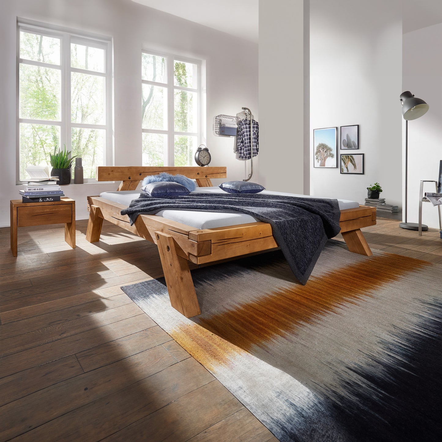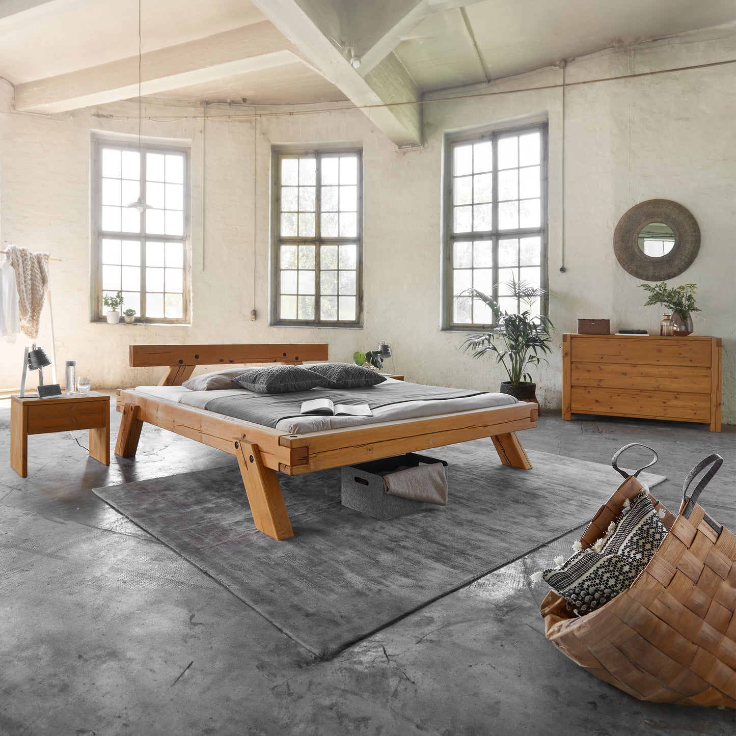 Ein cooles Bett, was durch seinen breiten, rundum verlaufenden Balken und die besonders gelungene Eckverbindung ins Auge sticht. Leicht abgeschrägte Füße fügen sich perfekt ins Gesamtbild ein und unterstreichen den massiven Charakter. Die rechteckigen Füße sind genauso breit wie der Bettrahmen, was das ursprüngliche Design in Szene setzt. Das Kopfteil ist ebenfalls in Balkenform gefertigt und vervollständigt die gelungene Optik.