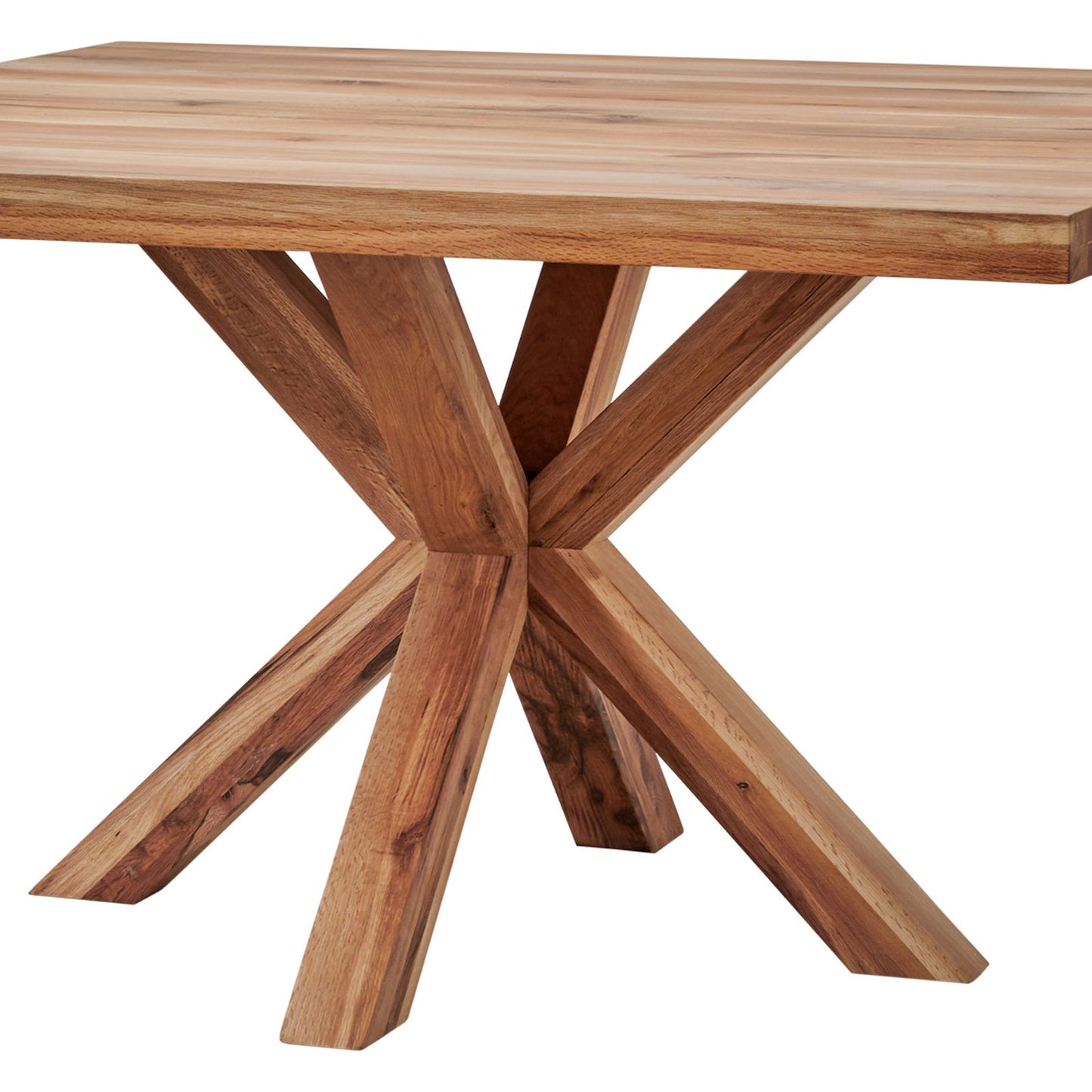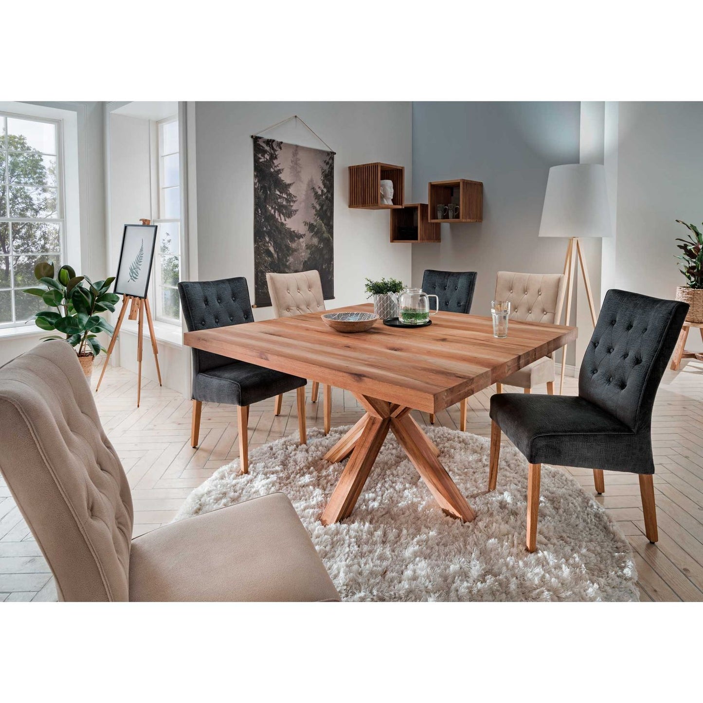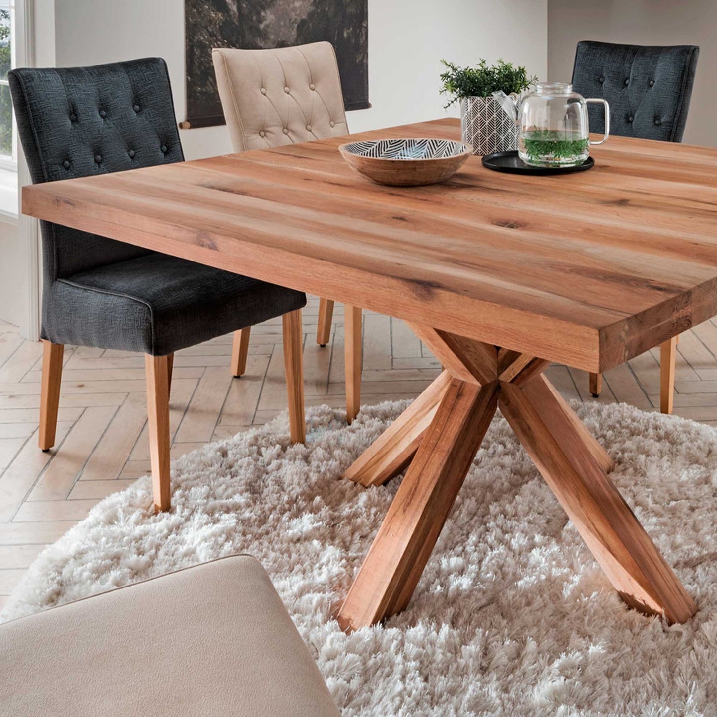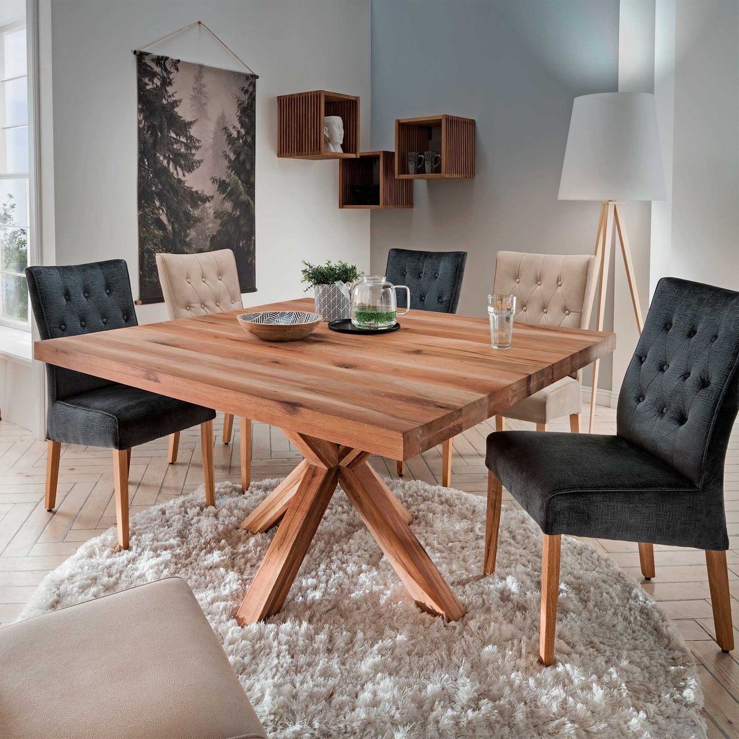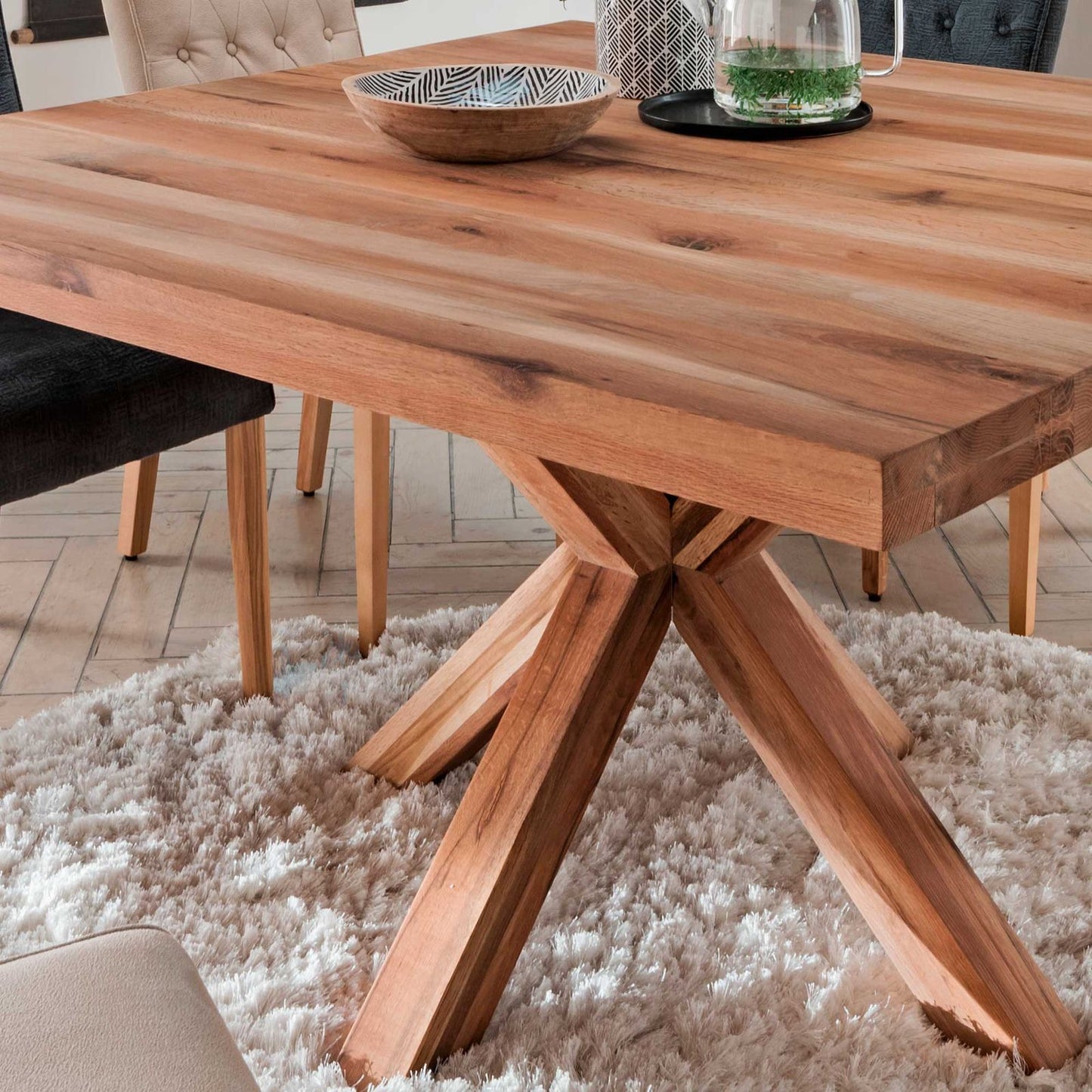 ist mehr als nur ein Platz zum Essen. Er überzeugt mit seiner natürlichen Ausstrahlung und sorgt für ein stilvolles Wohnambiente. Gefertigt nach alter Handwerkstradition hält dieser Esstisch allen Anforderungen im Alltag stand. Der Tisch überzeugt mit seiner klaren Linienführung und einem beeindruckenden Untergestell in Sternenform, welches 90 x 90 mm stark ist und für einen sicheren und stabilen Stand sorgt. Zeitlos schönes Design das sich immer und überall perfekt anpasst.