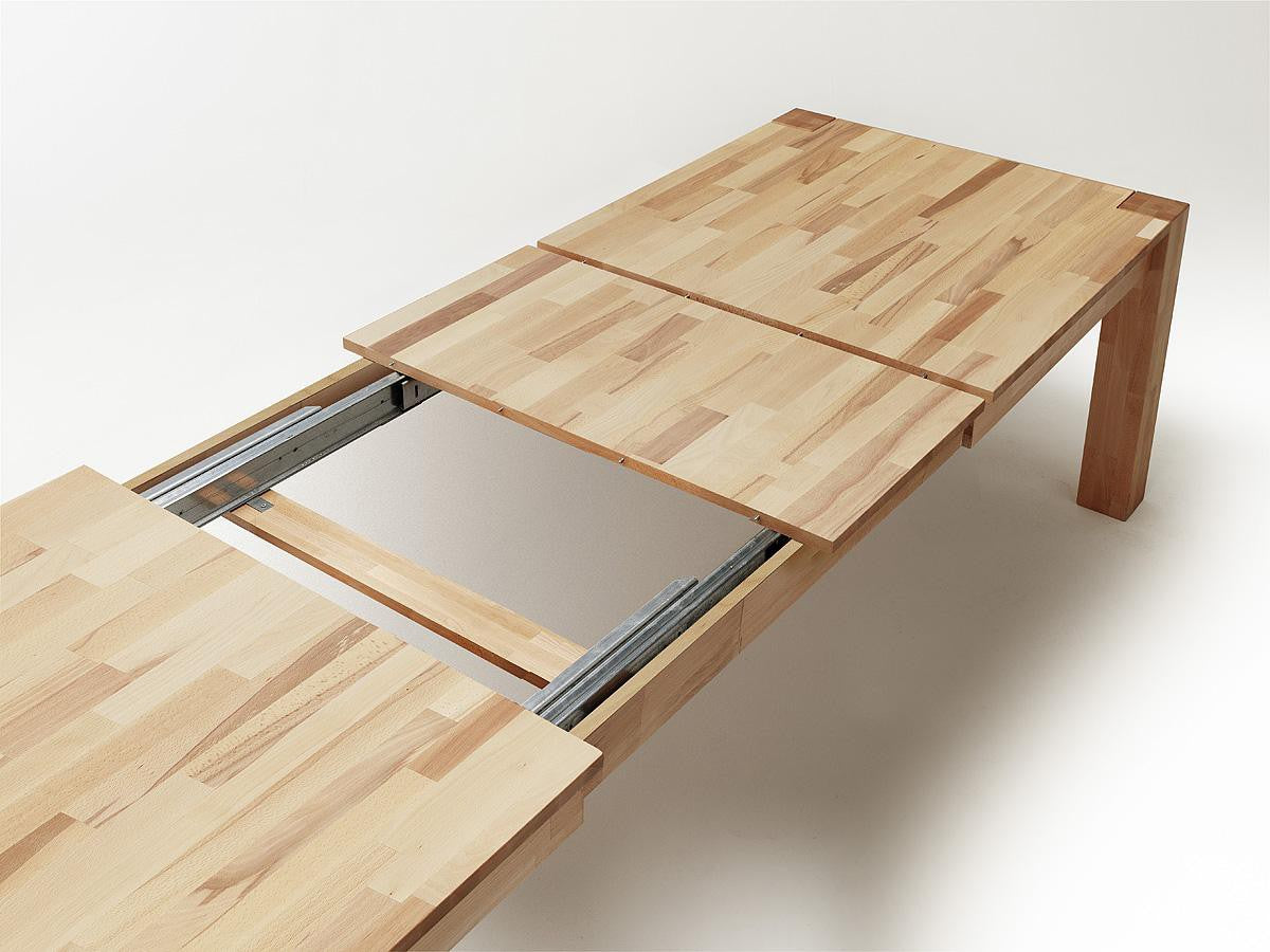 Vom Esstisch Peter gibt es drei Varianten mit Auszug durch eingelegte, im Tisch verstaubare Platten in 3 Größen.