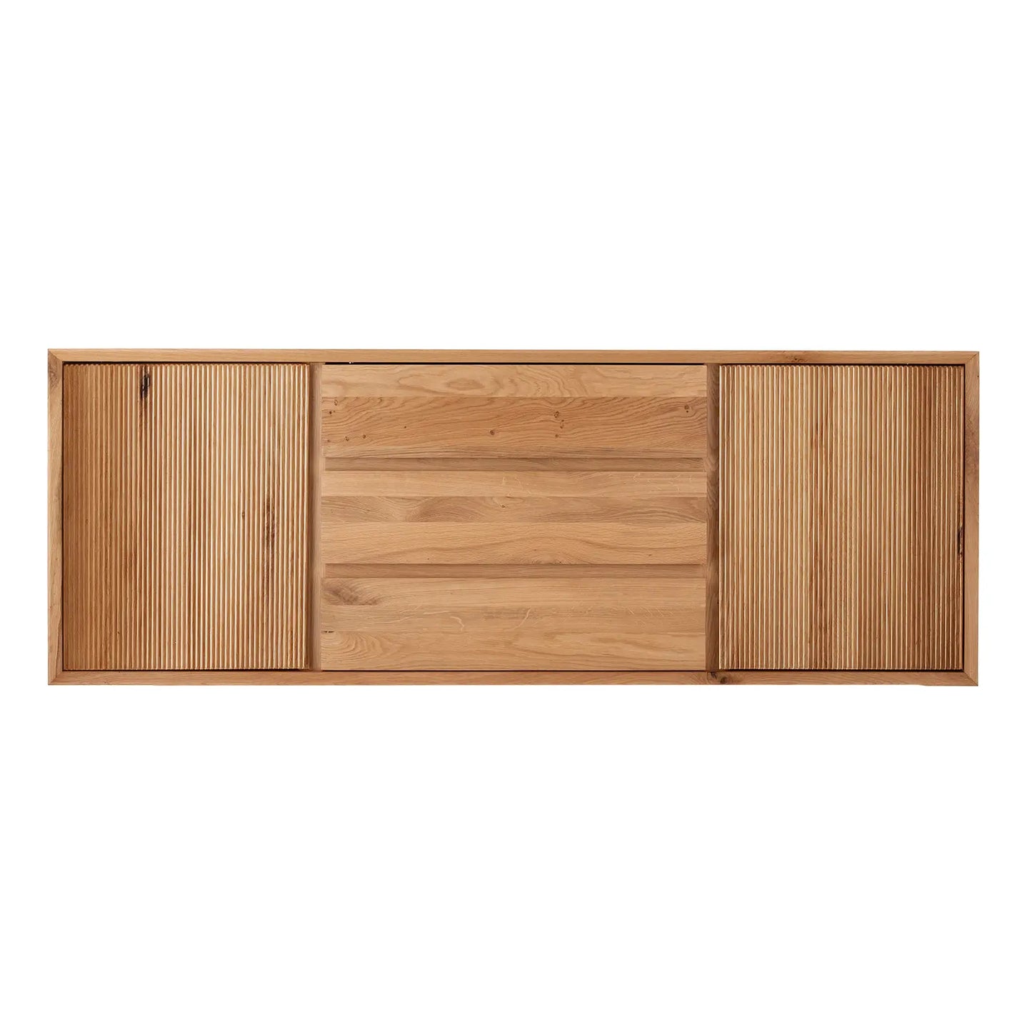 Das Sideboard Las Vegas verbindet Funktionalität mit einem ausdrucksstarken Design. Gefertigt aus massiver Wildeiche und naturgeölt, bringt es natürliche Wärme und zeitlose Eleganz in Ihre Wohnräume. Die Rillenfront auf den beiden Außentüren sorgt für ein kraftvolles Designstatement, während die grifflose Optik und die filigrane Schweizer Kante das Möbelstück optisch verfeinern.