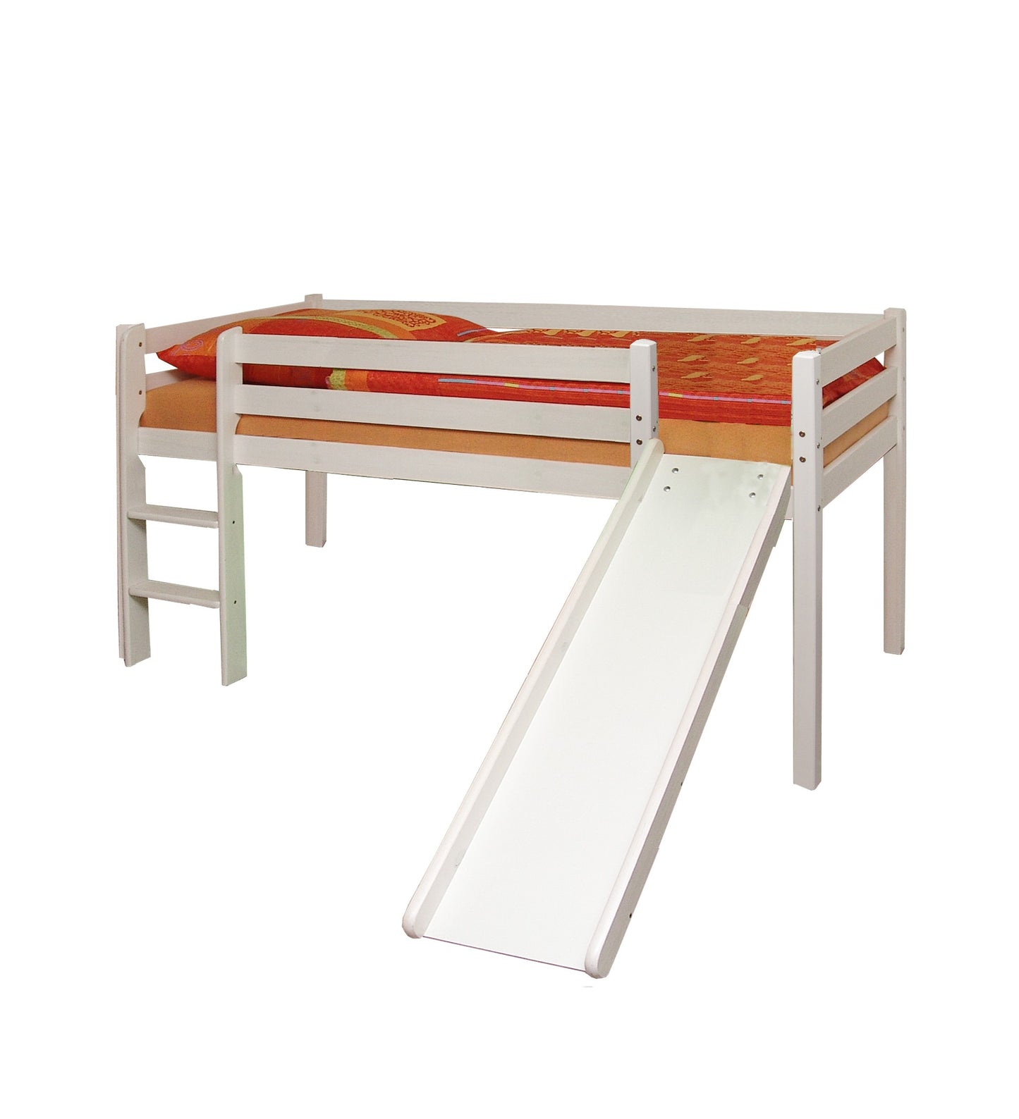 Tilo Hochbett mit Rutsche, Leiter und Vorhang Kinderbett Kiefer massiv weiß Motiv Piratenkopf - 9814-Tilo-W-V-12