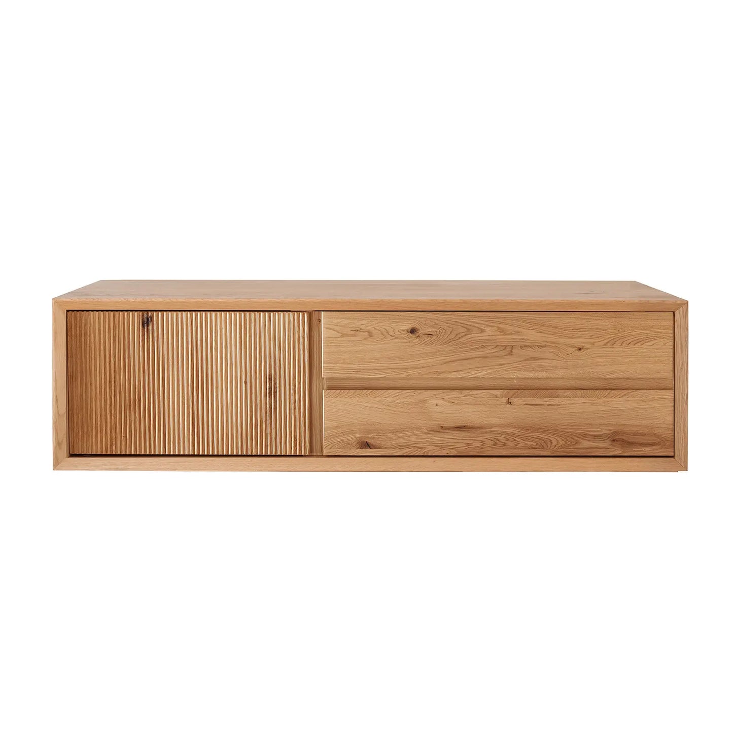 Der TV-Schrank Las Vegas kombiniert markantes Design mit cleverem Stauraum. Die charakteristische Rillenfront auf den Holztüren setzt ein starkes visuelles Statement, während der naturgeölte Korpus aus massiver Wildeiche für Wärme und Natürlichkeit sorgt. Die Schweizer Kante am Rahmen verleiht dem Möbel eine stilvolle Leichtigkeit – perfekt für moderne Wohnräume mit Anspruch.