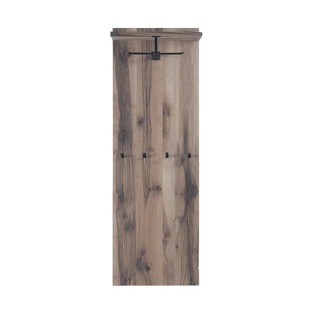 Die Rückwand aus massiver Balkeneiche ist durchzogen von typischen Aststrukturen und Rissverläufen. Die White-Wash-Oberfläche bringt Leichtigkeit in das rustikale Material und verleiht dem Paneel einen modernen Touch. Die schwarze Kleiderstange sowie die Metallhaken sorgen für optischen Kontrast und betonen den Industrial-Stil der ROCKiT-Serie.
