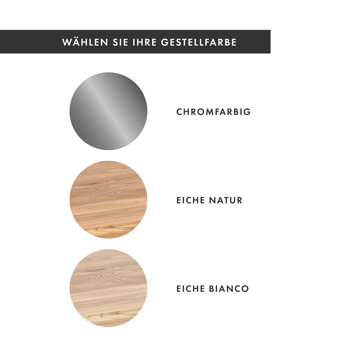 Die Tischplatte dieses Speisetisches beeindruckt nicht nur durch ihre natürliche Schönheit, sondern auch durch ihre außergewöhnliche Stabilität. Hergestellt aus erlesenem Eichenholz, ist sie in zwei attraktiven Ausführungen erhältlich: einer warmen, natürlichen Ölung und einer frischen Bianco-Ölung. Diese Oberflächenbehandlungen unterstreichen nicht nur die einzigartige Holzmaserung, sondern schützen den Tisch auch vor den Belastungen des Alltags. Ihr Esstisch wird so über die Jahre hinweg seine erstklassige Qualität bewahren. Das markante Tischgestell aus robustem Metall verleiht dem Tisch nicht nur eine moderne Ästhetik, sondern auch Stabilität und zuverlässige Haltbarkeit. Die Auswahl an verschiedenen Tischbeinen – sei es das X-Bein, U-Bein, A-Bein oder das einzigartige Spyder-Gestell – ermöglicht es Ihnen, Ihren Tisch ganz nach Ihren individuellen Vorlieben anzupassen.