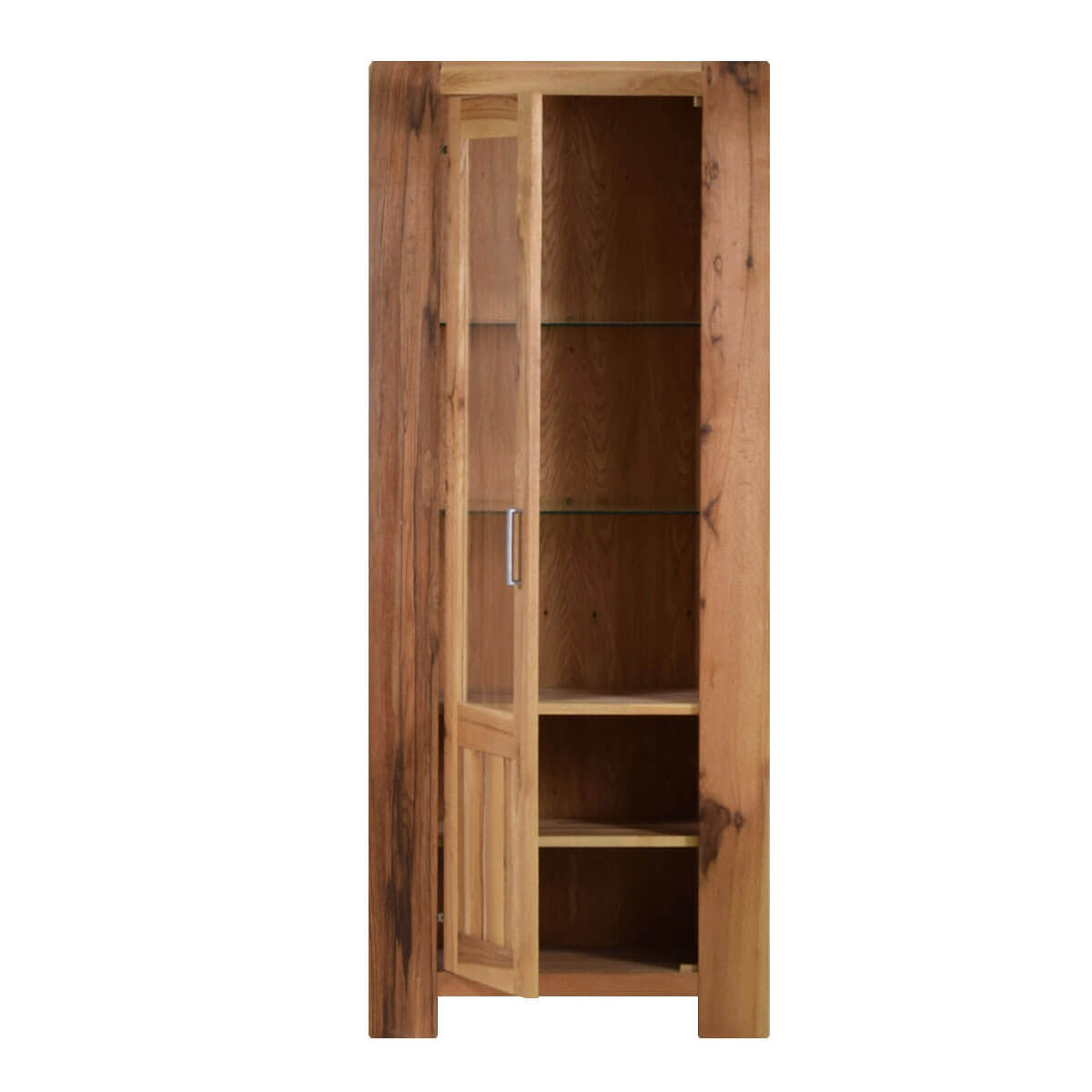 In dem oberen Bereich wurde der Tür eine Glasscheibe eingesetzt, hinter welcher sich zwei Glaseinlegeböden befinden. Dort haben Sie insgesamt drei Fächer, in denen Sie Ihre Bilderrahmen, Vasen, Figuren und andere Dekorationsartikel wundervoll in Szene setzen können. In dem unteren Bereich ist die Tür blickdicht. Dahinter verbirgt sich ein Holzeinlegeboden, sodass Sie zwei zusätzliche Stauraumfächer erhalten.